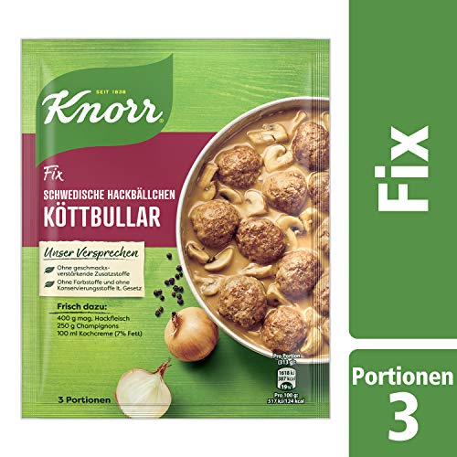 Typisch Schwedische Köttbullar – Hackbällchen und Champignons in einer leckeren, rahmigen Sauce. Zubereitung für: 400g Hackfleisch, 150g Champignons, 100 ml Schlagsahne oder Rama Cremefine zum Kochen (15% Fett) 1) Hackfleisch mit Salz und Pfeffer würzen und ca. 15 kleine Bällchen formen. Champignons putzen und vierteln. 2) Hackbällchen in etwas heißem Öl (z.B. Mazola) bei mittlerer Hitze ca. 6 Minuten rundherum braten. Champignons zufügen und mitbraten. 3) Hackbällchen an den Pfannenrand schieben. 350 ml kaltes Wasser und 100 ml Sahne zufügen und Beuteinhalt einrühren. Unter Rühren aufkochen. Bei schwacher Hitze ca. 5 Minuten kochen, dabei mehrmals umrühren. Mit den Knorr Fix Produkten begeistern Sie Ihre ganze Familie mit Leichtigkeit: Die beliebte Würzbasis sorgt für einen authentischen Geschmack der Gerichte und spart wertvolle Zeit beim Würzen und Abschmecken. Ganz einfach bereiten Sie damit köstliche Mahlzeiten zu – auch ohne Kocherfahrung. Die Zugabe von frischen Zutaten bringt Frische auf den Teller und ermöglicht eine Vielzahl an Variationen der Gerichte. Damit erhalten Sie viele herzhafte Rezeptideen rund um Fleisch, Fisch, Nudeln, Reis oder Gemüse – ohne Farbstoffe, geschmacksverstärkende Zusatzstoffe und Konservierungsstoffe. Fix gemacht und einfach lecker. Kennen Sie schon die vielen weiteren Produkte von Knorr? Dank unserer Fix-Produkte, Brühen, Saucen, Fertiggerichten, Suppen und Salatdressings gelingt jedes Gericht garantiert mit wenigen Handgriffen. Schnell und einfach erhalten so authentische Mahlzeiten ihren typischen Geschmack – egal, ob abwechslungsreiche vegetarische oder vegane Küche, herzhafte Fleischgerichte oder leckere Gemüsevariationen. Dabei ist es die Komposition ausgewählter hochwertiger Zutaten, die jedes Knorr Produkt besonders macht. Knorr verarbeitet nur sorgfältig schonend getrocknete Zutaten, denn das Trocknen ist eine der ältesten Methoden, um Lebensmittel natürlich haltbar zu machen. Da der Geschmack und die Nährstoffe der frischen Zutaten weitgehend erhalten bleiben, passen Lebensmittel aus getrockneten Zutaten ideal in unseren stressigen Alltag. Essen mit Knorr ist unkompliziert und sorgt darüber hinaus für ein gutes Gefühl: Über 90 Prozent der Zutaten kommen heute schon aus nachhaltigem Anbau. Denn wir bei Knorr glauben, dass die Verwendung nachhaltig angebauter und beschaffter Zutaten einen großen Unterschied für den Geschmack unserer Produkte, das Wohlbefinden der Landwirte und die Zukunft des Planeten macht. Knorr – Geschmack mit gutem Gefühl.