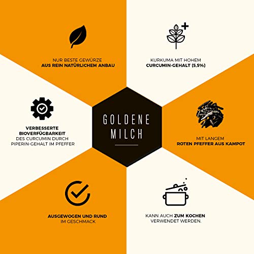 HOCHWERTIGE ZUTATEN: Die Goldene Milch Gewürzmischung enthält u.a. Kurkuma Gewürz (5,5 % Curcumin) und Langer Roter Pfeffer (mit viel Piperin). Das im Pfeffer enthaltene Piperin sorgt für eine bessere Verwertung des Cucurmins.