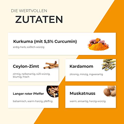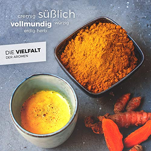 LECKERE GEWÜRZE: Unsere Curcuma Latte Mischung enthält neben Kurkuma Extrakt noch Muskatnuss, Ceylon Zimt, Kardamom und Stangenpfeffer. Die Aromenspektrum reicht von erdig-herb, über balsamisch bis zitronig-frisch.