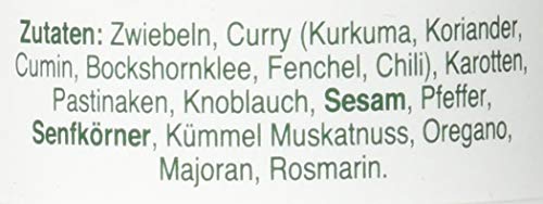 Zutaten: Zwiebeln, Curry (Curcuma, Coriander, Cumin, Bockshornklee, Fenchel, Chillies), Karotten, Pastinaken, Knoblauch, SESAM, Pfeffer, SENFKÖRNER, Kümmel, Muskatnuss, Oregano, Majoran, Rosmarin. [Spuren: Weizen, Ei, Soja, Milch, Sellerie]
